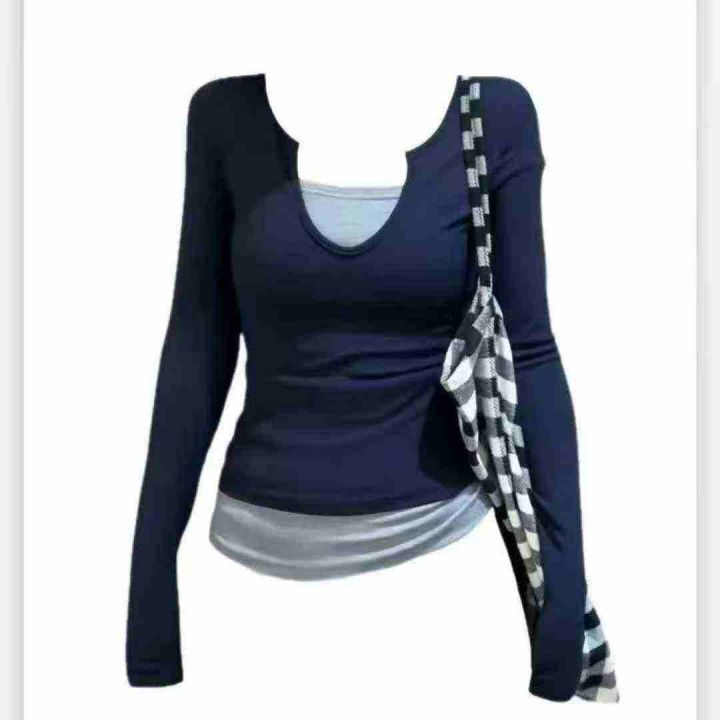 全清4.8元,6180件美式甜辣妹韩版假两件长袖t恤女春夏修身打底衫撞色纯欲显瘦上衣,独立包装,码数M-2XL,分货➕0.5