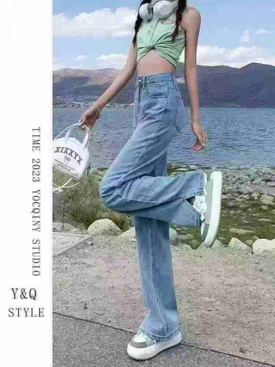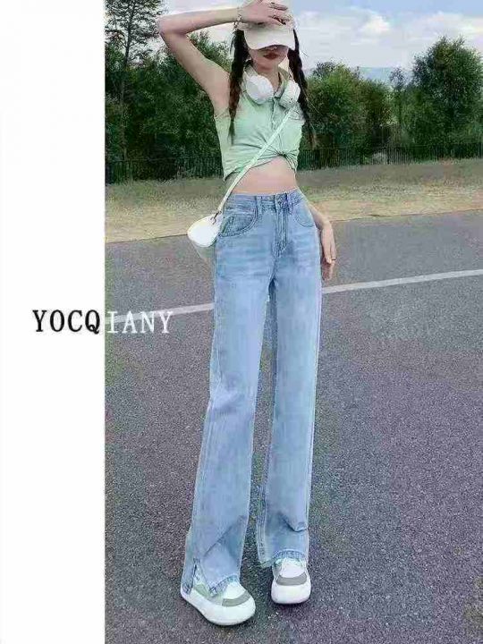 高弹力直筒牛仔裤女高腰宽松显瘦简约开叉阔腿裤75条全...