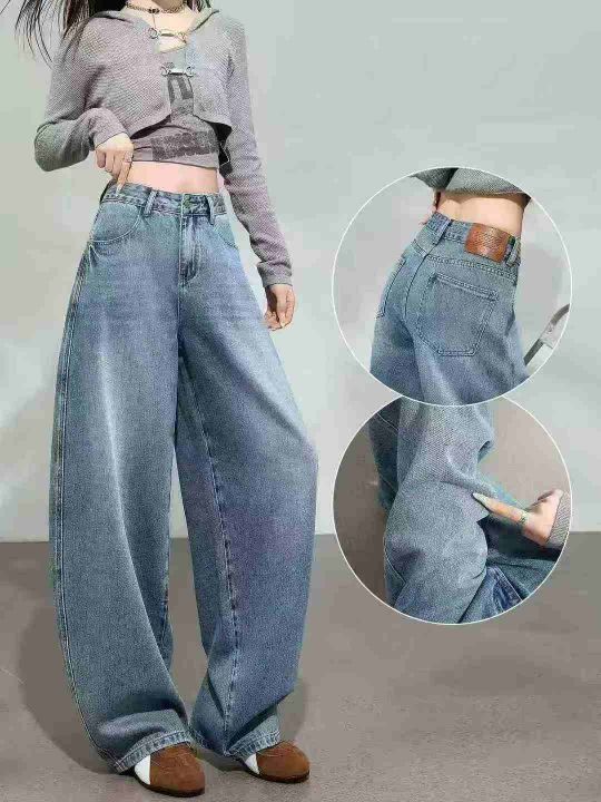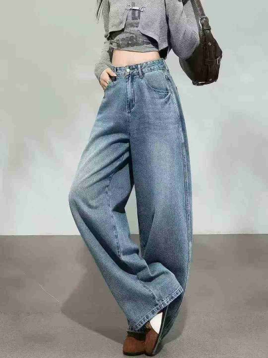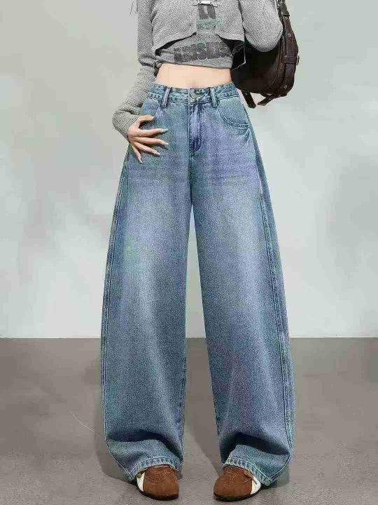 蓝色弯刀直筒牛仔裤女新款高腰显瘦百搭宽松镰刀阔腿裤...