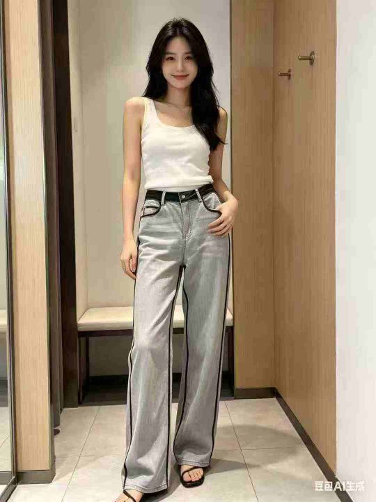 580件韩系松弛感复古做旧小辣妹高腰直筒烟灰色阔腿休闲牛仔裤,尺码2-5(S-X...