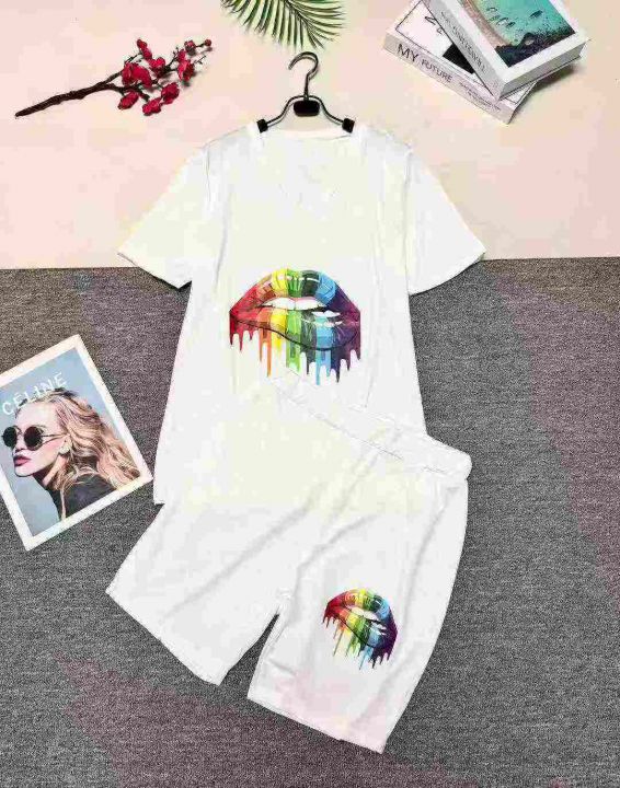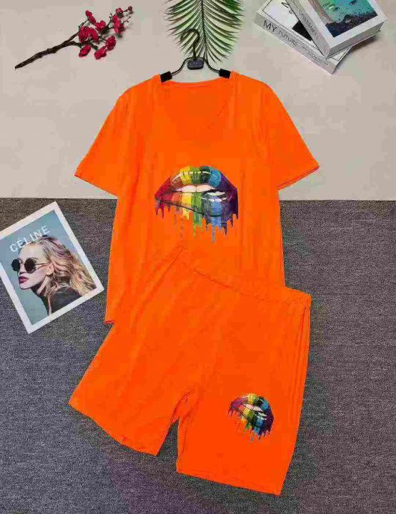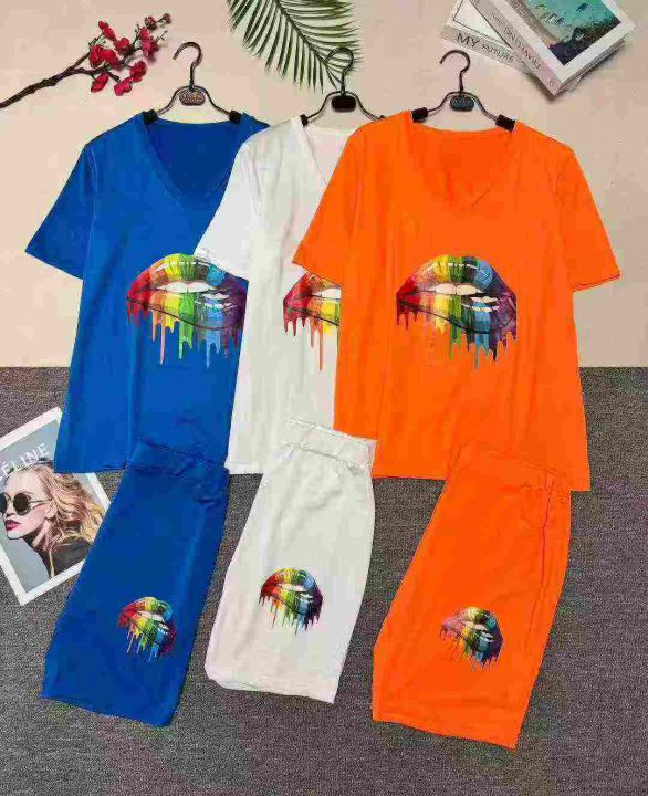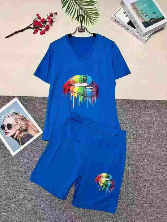 欧美时尚V领大嘴唇印花短袖短裤两件套,整款三色,数量:144套,码数:S-2XL,品质好,拉链式独立包装。