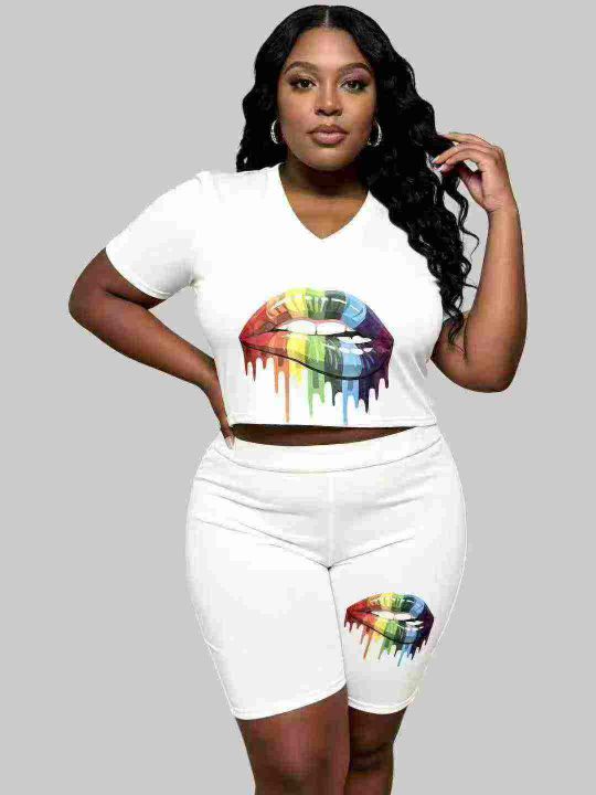 7.8清欧美时尚V领大嘴唇印花短袖短裤两件套,整款三色...
