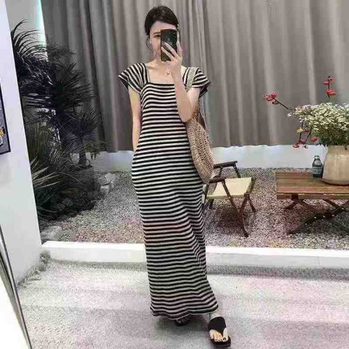 天猫在售款500件左右高品质夏季小个子撞色条纹方领短袖连衣裙,码数S-L,单款两色,高弹力,独立包装带吊牌