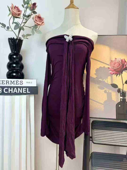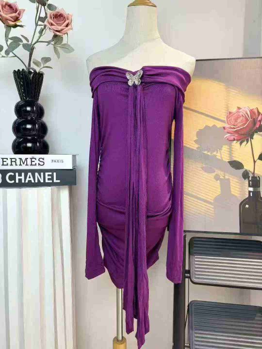 一字肩紫色挂脖长袖连衣裙女春秋冬季性感辣妹紧身收腰包臀短裙子 独立包装 码数1-4码。数量630件 全清5.9 分货加0.5