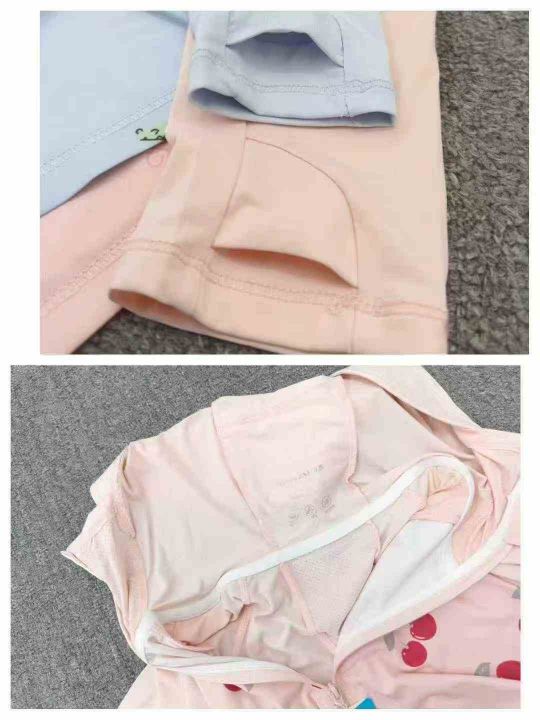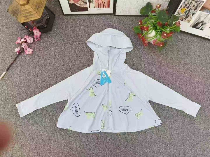 统一品牌童装印花防晒衣,数量2500件左右,尺码110--160,两个色,后领包边,锦纶氨纶面料,独立包装带吊牌,大货干净整洁质佳!模特图供参考
