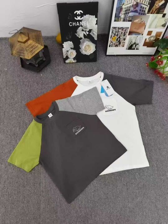 品牌高品质插肩拼色童装T恤短袖 数量1500件左右 尺码110--160 整款两个色 胸前口袋 后面印花 后领包边 独立包装带吊牌 货品整洁质佳