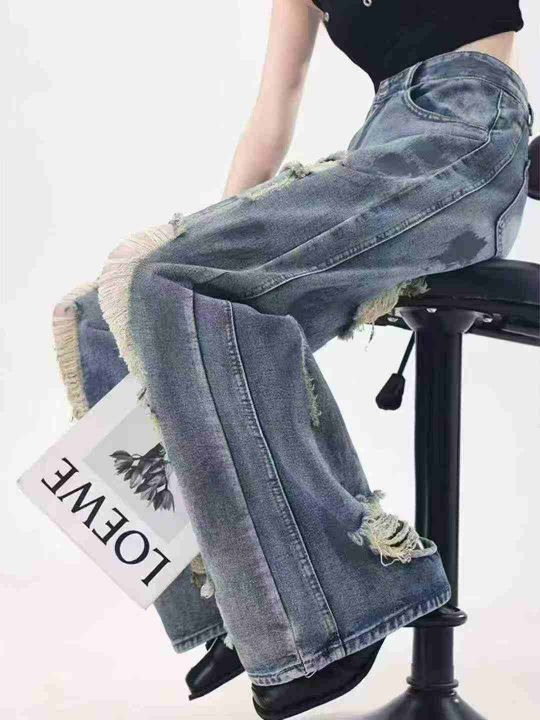 复古扎染废土风破洞女牛仔裤水洗垂感阔腿拖地裤,码数...