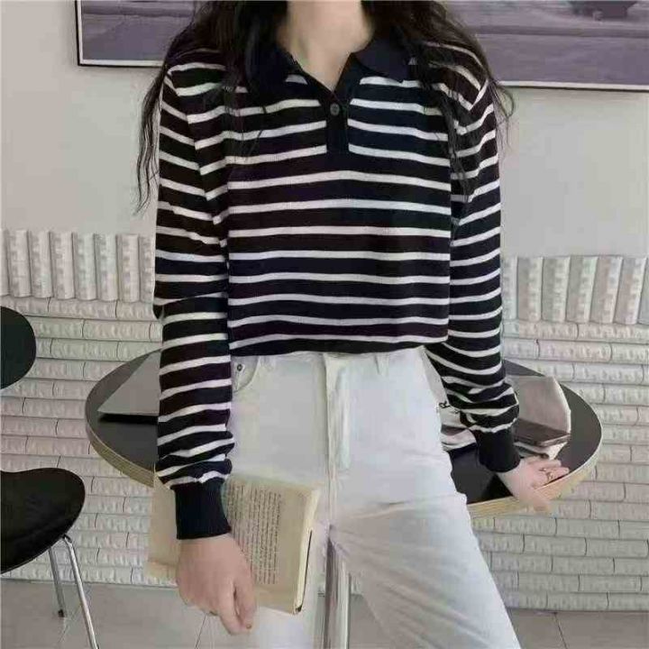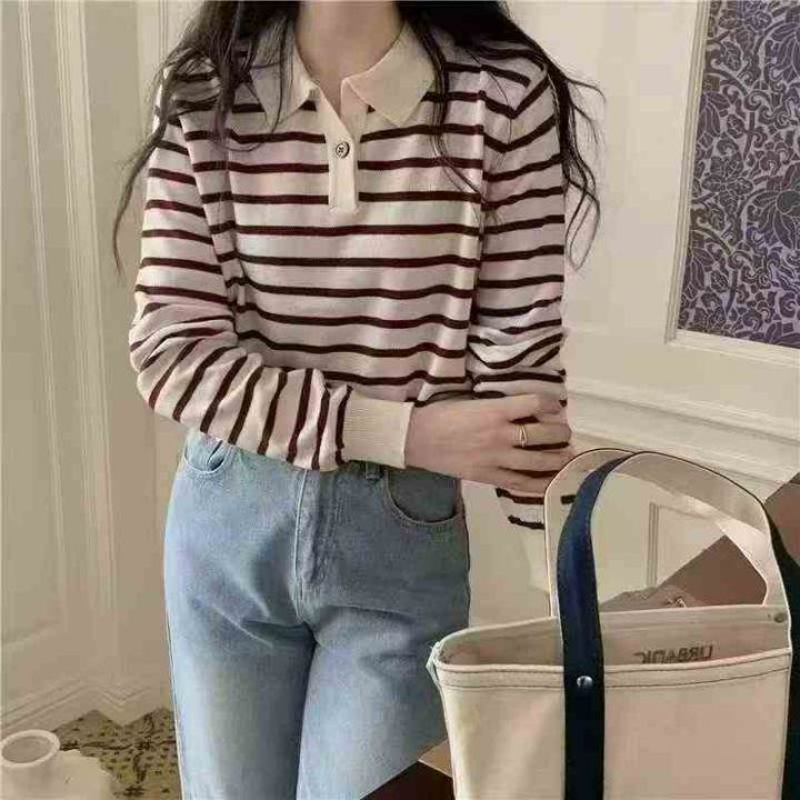 1200件早秋新款韩系宽松高级感撞色条纹百搭POLO领长袖针织毛衣,独立包装,均码面料柔软舒适,宽松款,全清6.5分+1