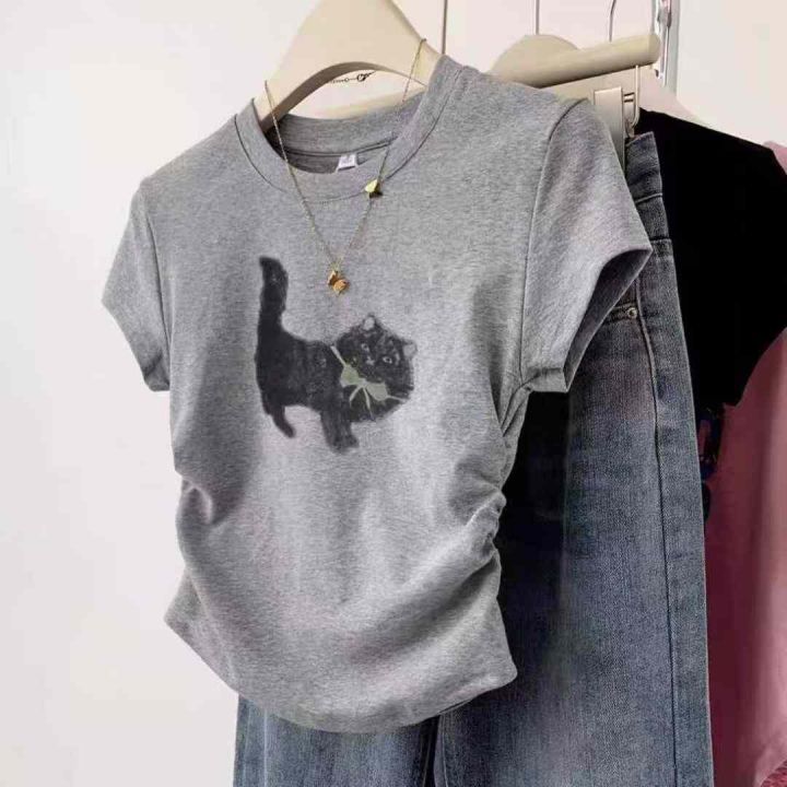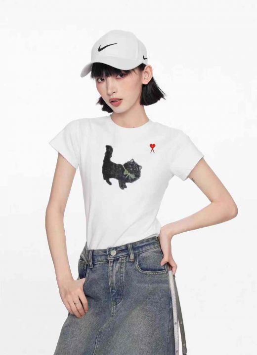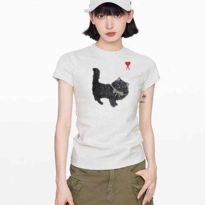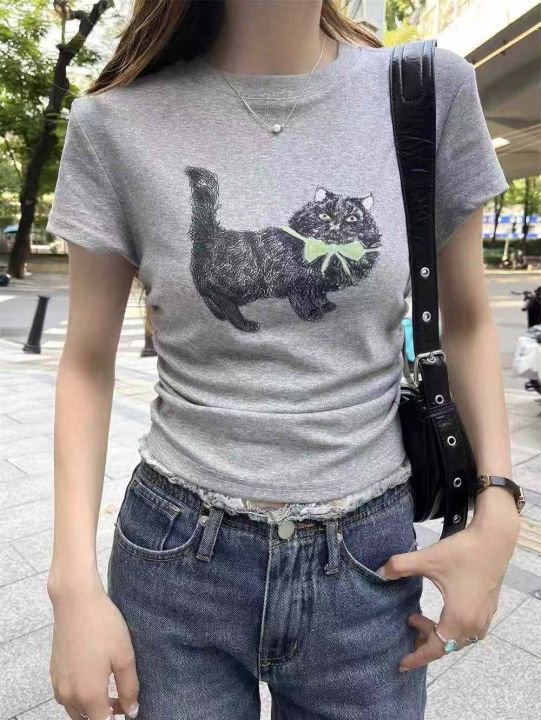 ☕️纯棉圆领印花修身短款上衣女夏夏季新款潮牌猫咪正...