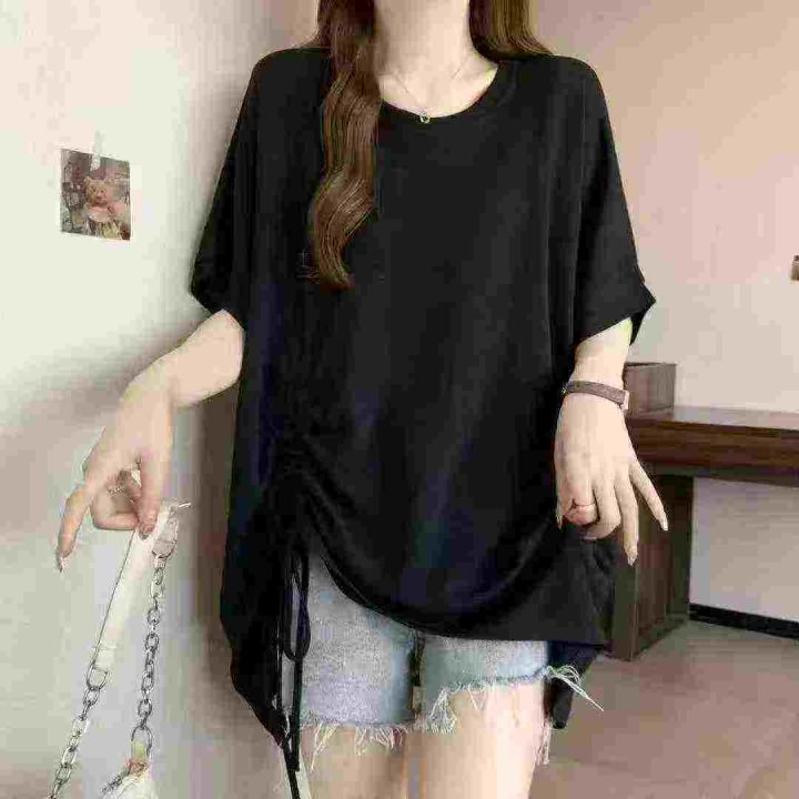 网红开衩不规则中长款中袖抽绳防晒衣t恤女夏洋气时髦...