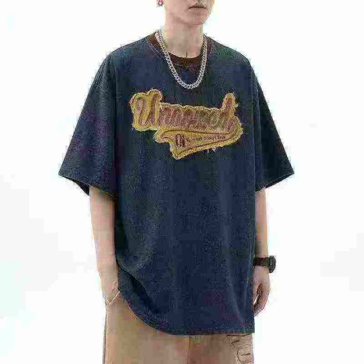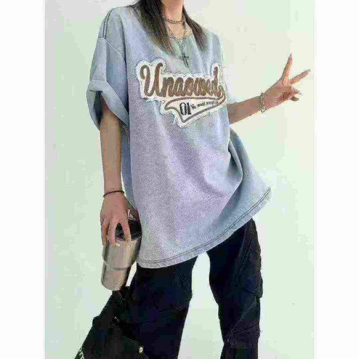 夏季美式复古男女同款重工刺绣印花牛仔短袖T恤宽松圆领休闲半袖上衣,独立包装,数量80件,尺码M-3XL