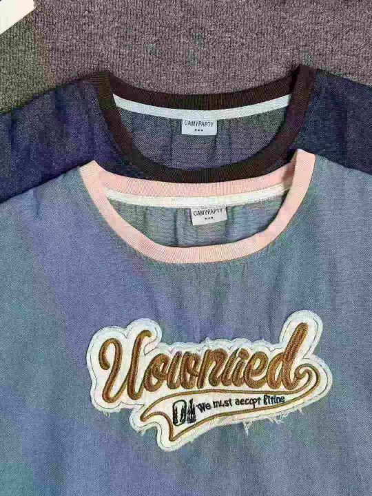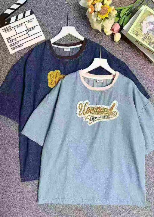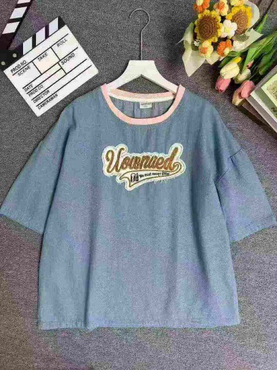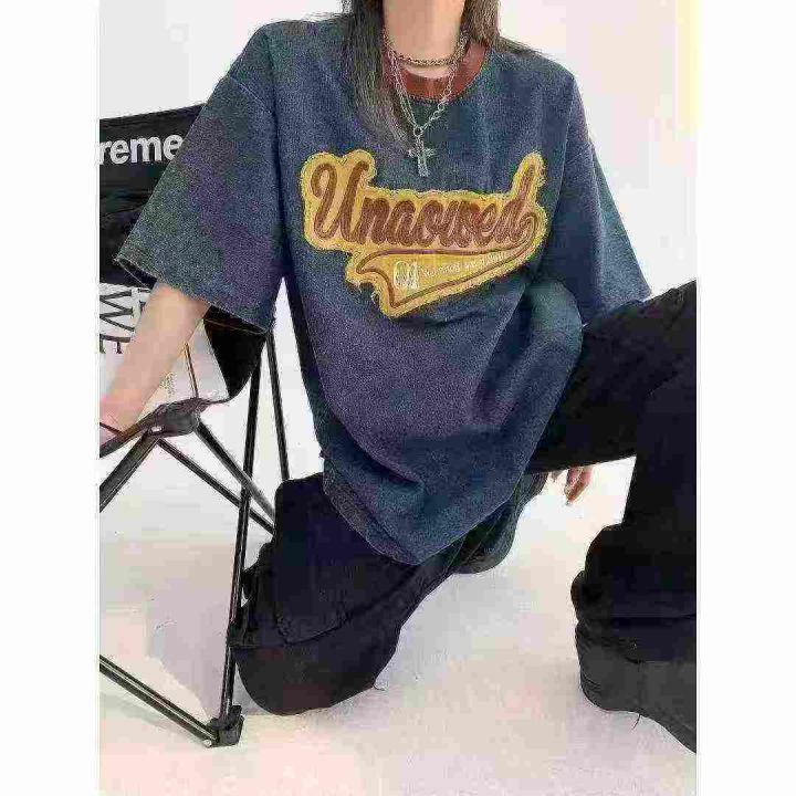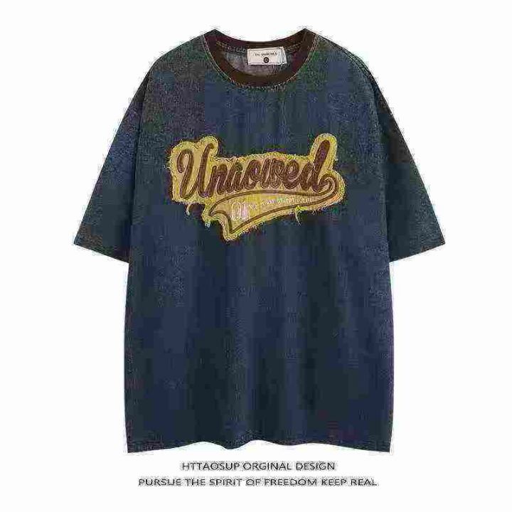 夏季美式复古男女同款重工刺绣印花牛仔短袖T恤宽松圆领休闲半袖上衣,独立包装,数量80件,尺码M-3XL