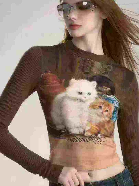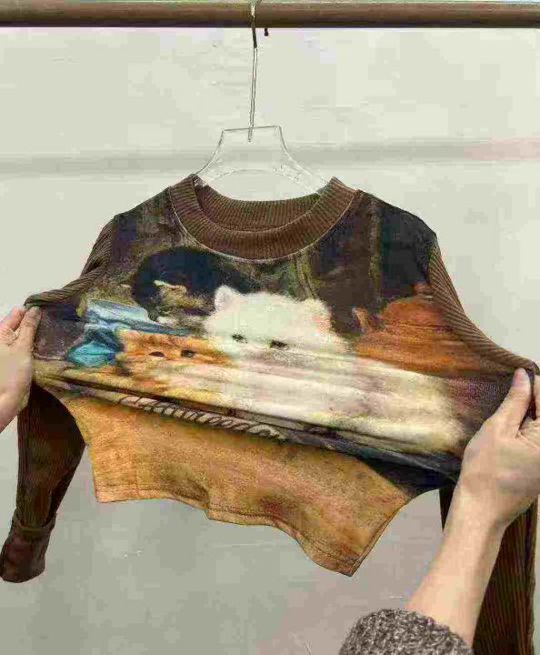猫咪印花高级感辣妹上衣154件6.8,金丝绒拼接棉袖子,...