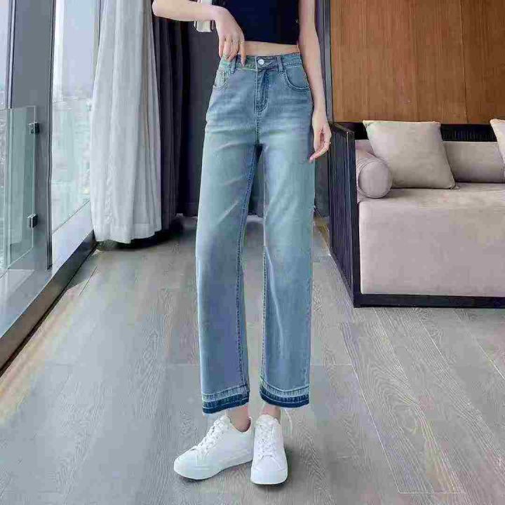 高品质高腰毛边牛仔裤女春秋新款脚口直筒女装阔腿牛仔...