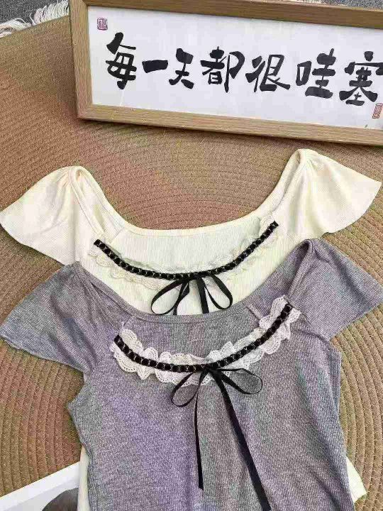 法式蕾丝拼接短袖499件6.5,面料柔软有弹力,蝴蝶结蕾...