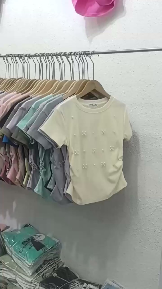 ☕️纯棉重工辣妹短袖T恤立体钉珠弧形下摆精致泡珠工艺修身显瘦气质辣妹T恤...