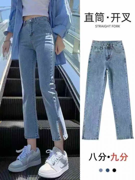 高腰小个子薄款弹力开叉直筒牛仔裤女设计感烟管裤560件,独立包装带吊牌,...