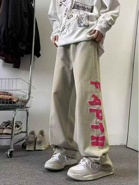 春秋新款美式高街vibe风字母植绒刺绣小众设计感男士直...