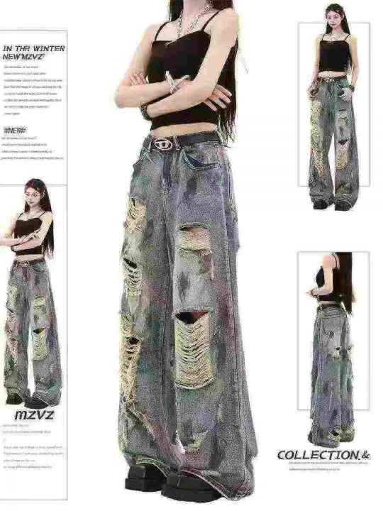 复古扎染废土风破洞女牛仔裤水洗垂感阔腿拖地裤,码数...