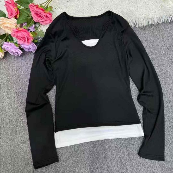 全清4.8元,6180件美式甜辣妹韩版假两件长袖t恤女春夏修身打底衫撞色纯欲显瘦上衣,独立包装,码数M-2XL,分货➕0.5