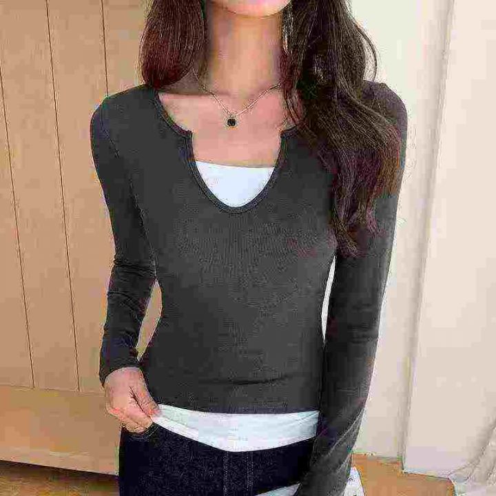 全清4.8元,6180件美式甜辣妹韩版假两件长袖t恤女春夏修身打底衫撞色纯欲显瘦上衣,独立包装,码数M-2XL,分货➕0.5