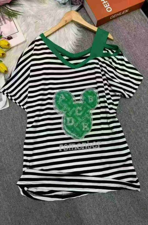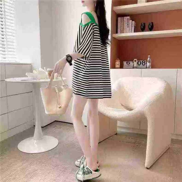 纯棉条纹露肩短袖t恤女夏装学生中长款半袖上衣潮ins,独立包装,M-XL,数量94件,货号118#23