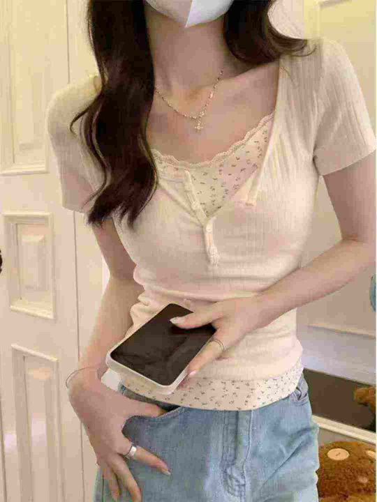 [月亮]:蕾丝花边假两件拼接碎花辣妹T恤