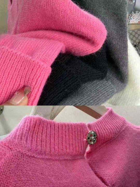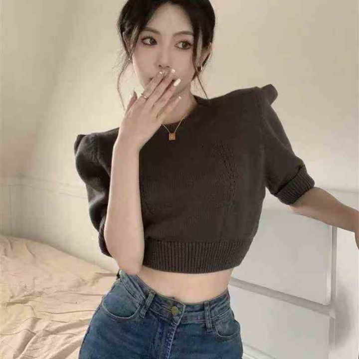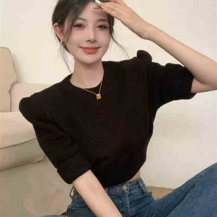 韩版高级感泡泡袖针织衫女士打底百搭短款上衣,整款4...