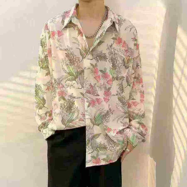 港风古着花衬衫男女复古痞帅百搭宽松设计感小众长袖衬衣,独立包装,码数S-...