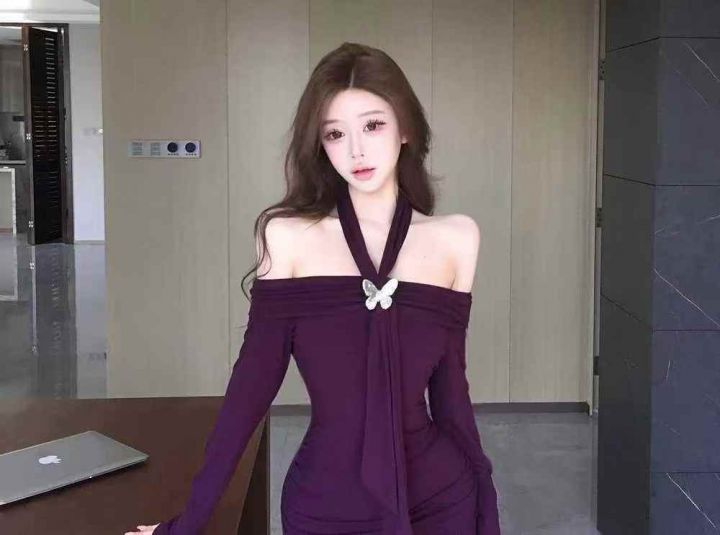 一字肩紫色挂脖长袖连衣裙女春秋冬季性感辣妹紧身收腰包臀短裙子 独立包装 码数1-4码。数量630件 全清5.9 分货加0.5
