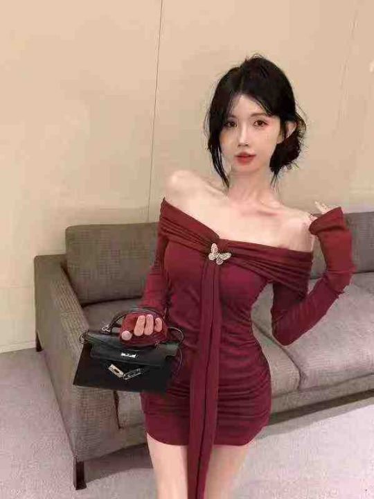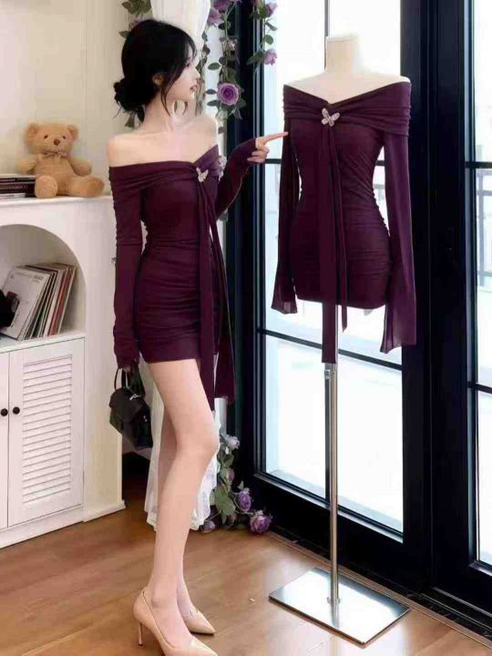 一字肩紫色挂脖长袖连衣裙女春秋冬季性感辣妹紧身收腰包臀短裙子 独立包装 码数1-4码。数量630件 全清5.9 分货加0.5