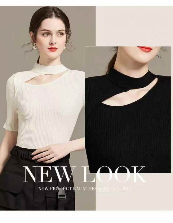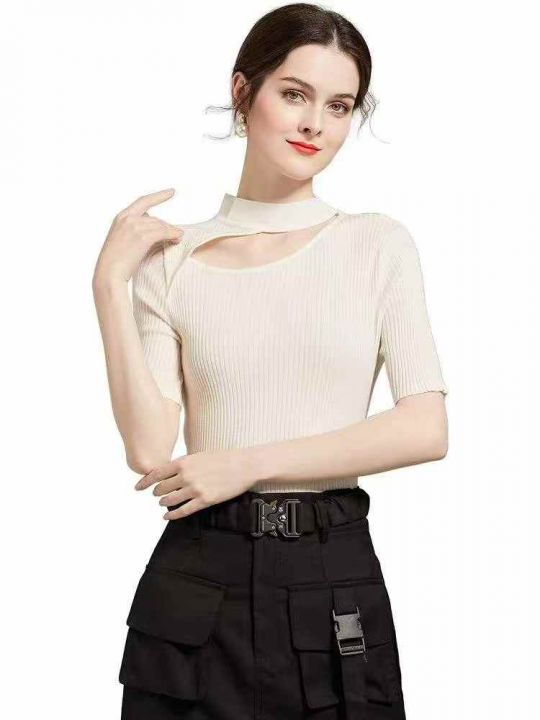 夏季新款时尚心机挂肩挖空露锁骨短袖针织小衫,独立包...