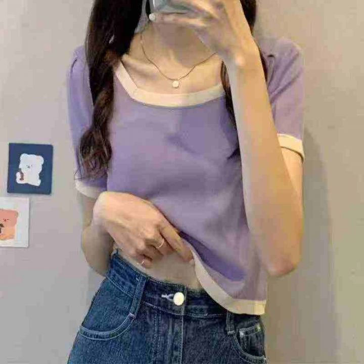 夏季新款蕾丝花边拼接假两件修身显瘦纯欲穿搭短款T恤上衣, 面料亲肤舒适高...