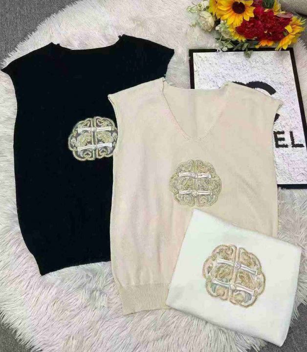 夏季新款大码胖妹妹新中式绣花V领针织T恤,独立包装,...