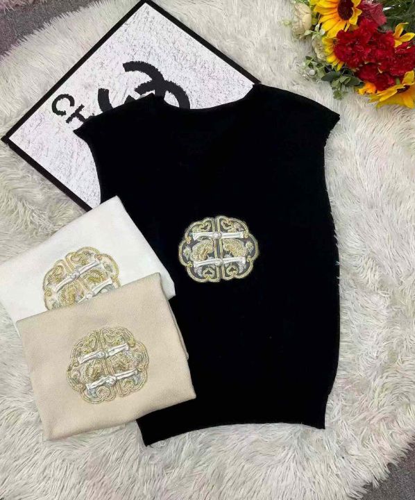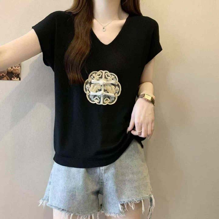 夏季新款大码胖妹妹新中式绣花V领针织T恤,独立包装,...