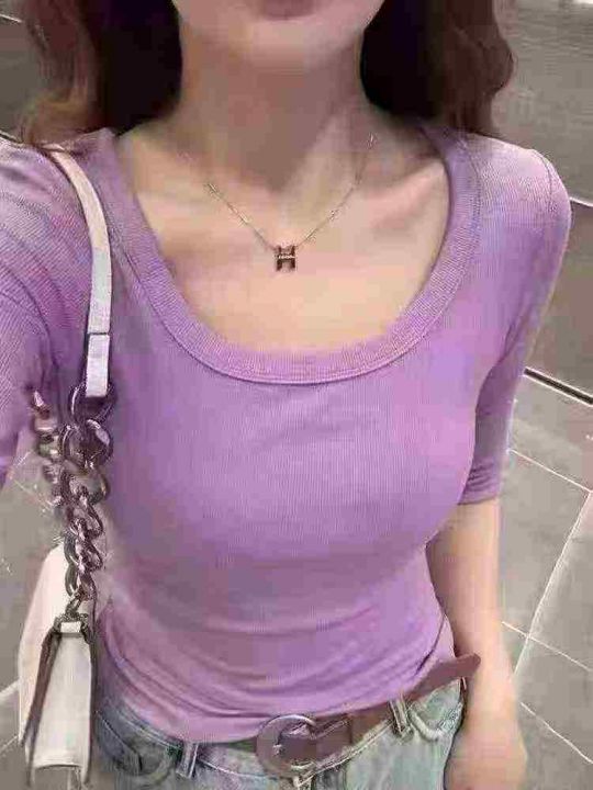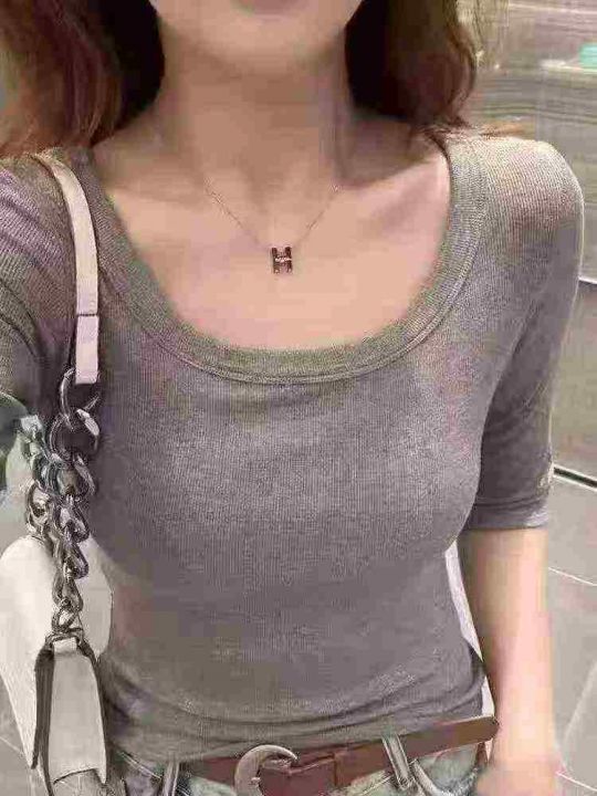 夏季新款五分袖U领螺纹t恤百搭修身显瘦时尚中袖打底衫...