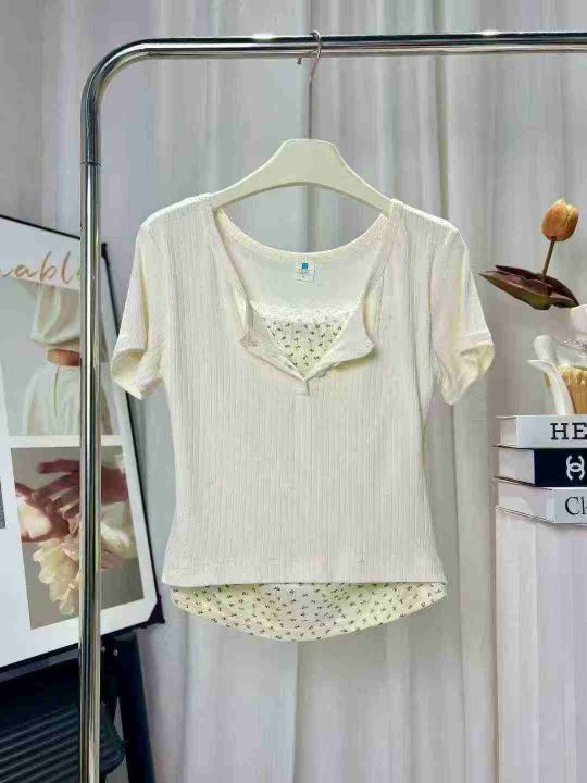 夏季新款蕾丝花边拼接假两件修身显瘦纯欲穿搭短款T恤...