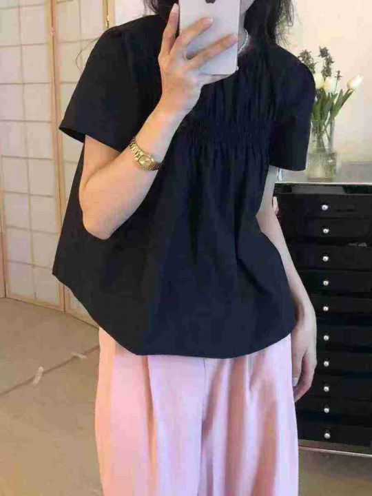 [月亮]:韩系气质松紧抽褶设计辣妹上衣