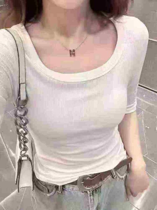 夏季新款五分袖U领螺纹t恤百搭修身显瘦时尚中袖打底衫...