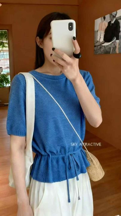 夏季新款韩系设计款收腰显瘦冰麻针织短袖,独立包装,...