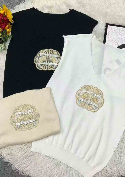 夏季新款大码胖妹妹新中式绣花V领针织T恤,独立包装,...