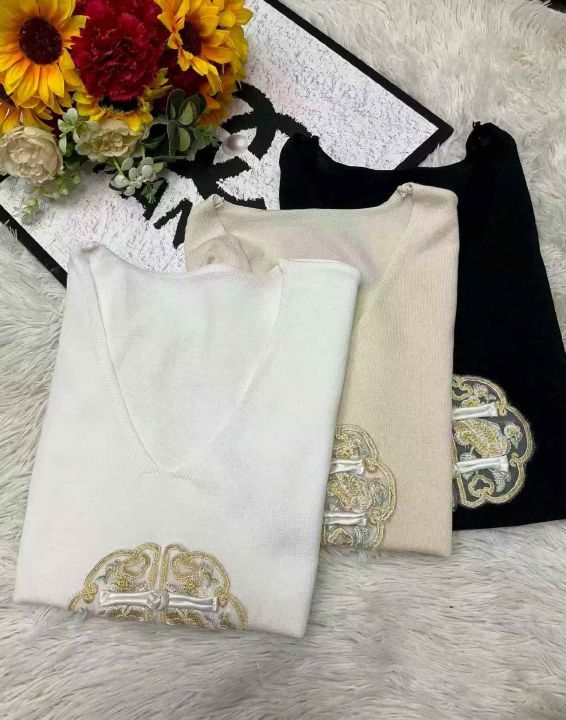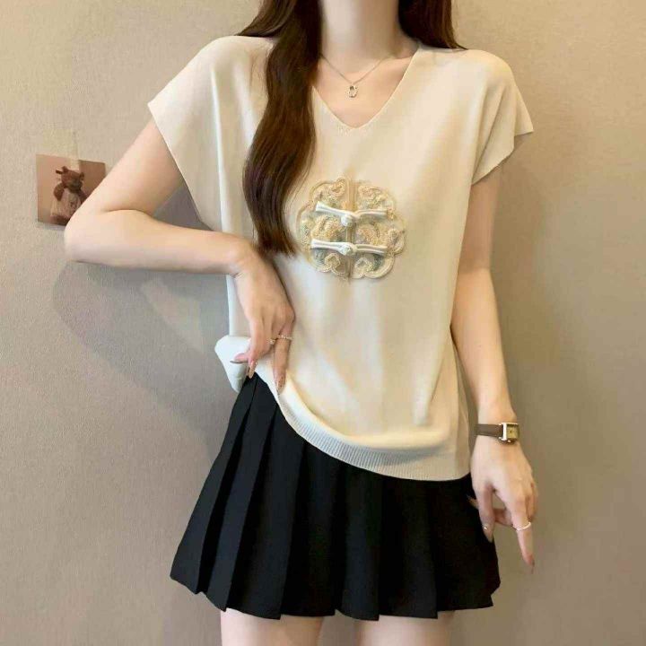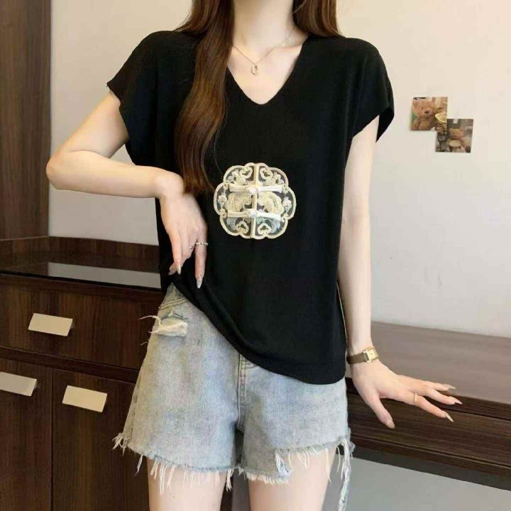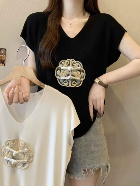 夏季新款大码胖妹妹新中式绣花V领针织T恤,独立包装,...