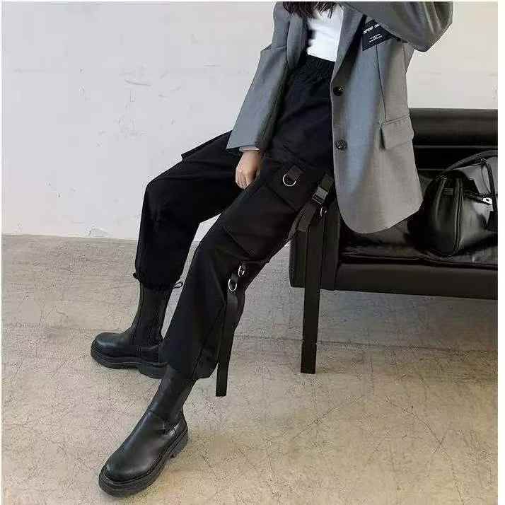 春秋新款弹力复古多袋工装松紧腰休闲裤,独立包装带吊...