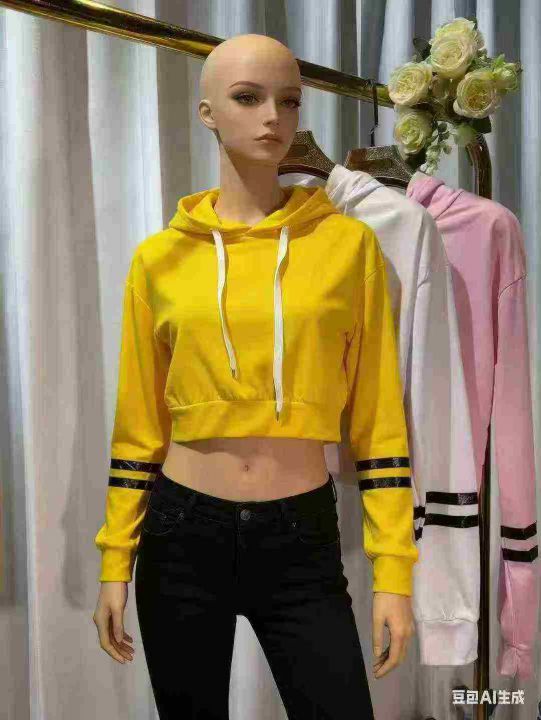 辣妹高腰连帽卫衣,长袖套头连帽高腰卫衣