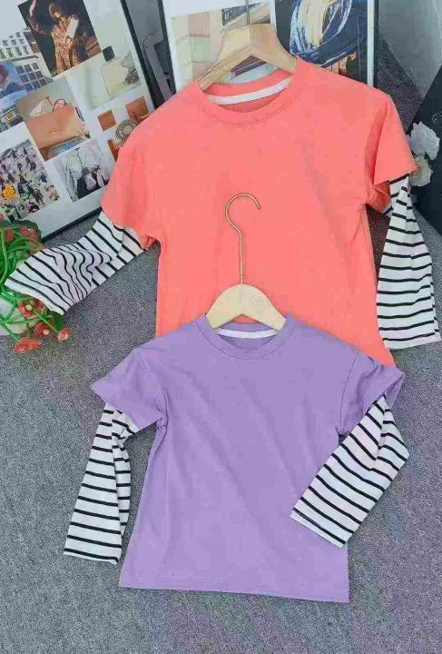 418件童装拼接袖打底衣,码数90~150码,10件一包装,单款两色。