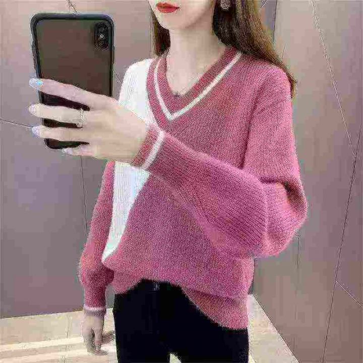 秋冬新款仿水貂绒V领套头洋气撞色设计感小众套头毛衣...