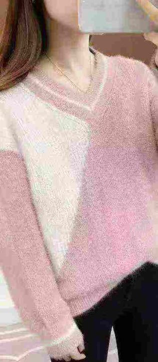 秋冬新款仿水貂绒V领套头洋气撞色设计感小众套头毛衣...