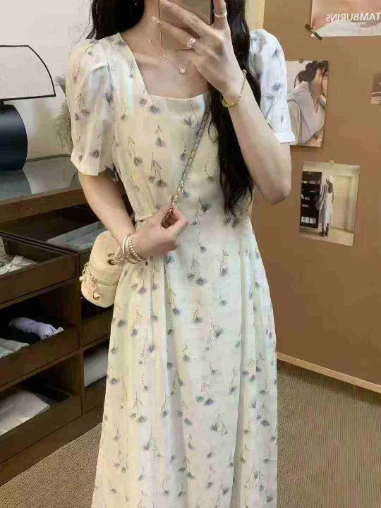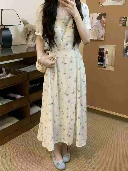 法式方领碎花连衣裙2025夏季新款收腰显瘦气质130件,...