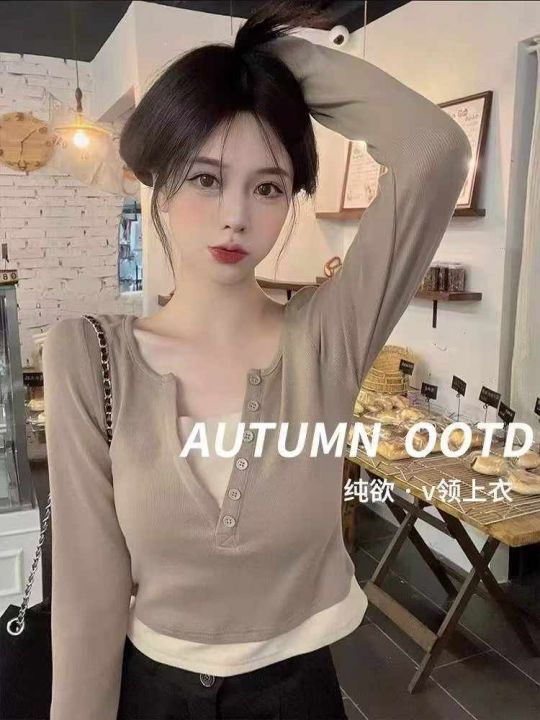 春季新款韩版正肩假两件V领修身显瘦设计感长袖上衣,...