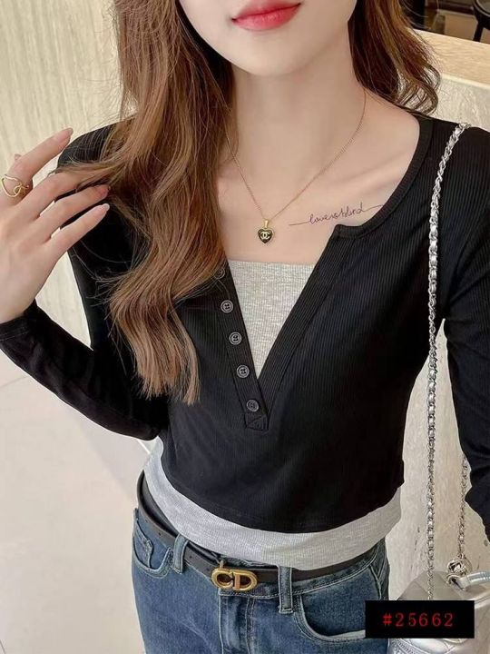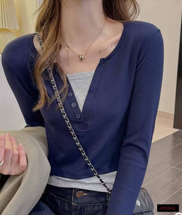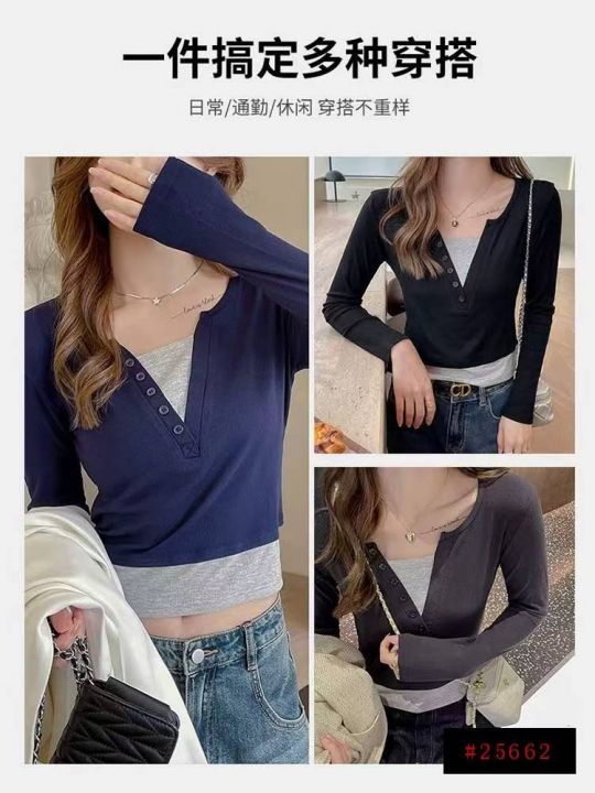 春季新款韩版正肩假两件V领修身显瘦设计感长袖上衣,...